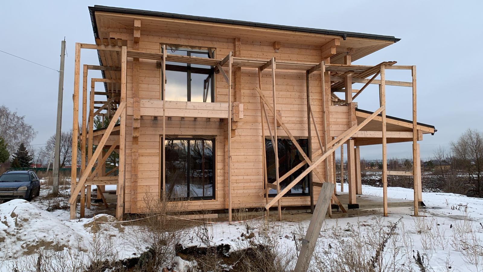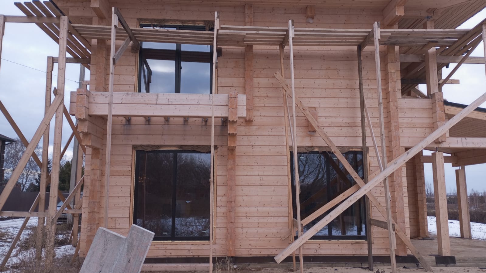 Остекление строящегося дома. Окна Veka Softline Premium 70 мм, ламинация «дуб морëный», замкнутый контур армирования, двухкамерный стеклопакет 42 мм с мультифункциональным и энергосберегающим стёклами, фурнитура Siegenia Titan, ручки Roto.